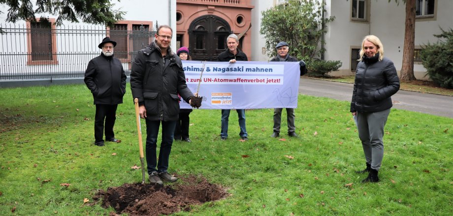 Foto: Hoffen, dass der kleine Ginkgo-Setzling zu einem großen Symbol für den Frieden heranwächst: Hans Sifft und OB Dr. Heike Kaster-Meurer (Vordergrund) mit (Hintergrund) Akteuren von „Aktiv für Frieden Bad Kreuznach“ und Marco van Bel, Leiter Museen Schlosspark und Römerhalle.