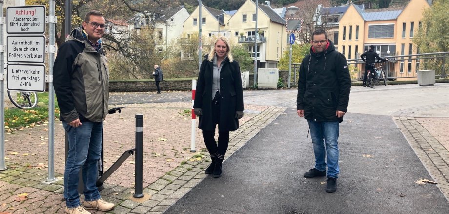 Foto: Am 2. November startete die Testphase, v.l.: Sebastian Kunz (Abteilung Tiefbau und Grünflächen), OB Dr. Heike Kaster-Meurer und Philipp Geib (Leiter Abteilung Tiefbau und Grünflächen) stellten die Polleranlage vor.