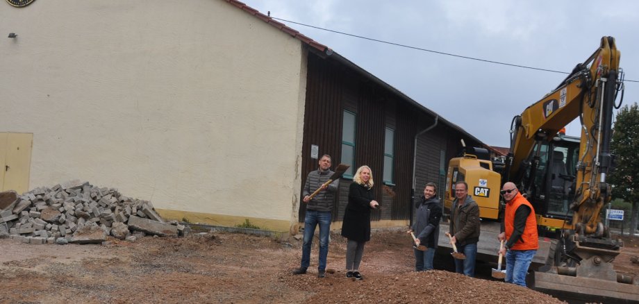Foto: Sie schwangen die Schaufeln: Mirko Kohl, Dr. Heike Kaster-Meurer, Ingo Naskowski, Hans Sifft (beide Abteilung Tiefbau und Grünflächen) und Joachim Gerharz (Bauunternehmer).