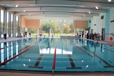 Die Gäste des neuen Hallenbades, das nun am Montag, 20. September, um 13 Uhr für die Öffentlichkeit geöffnet wird, können sich auf ein großes 25-Meter-Becken mit sechs Bahnen und Sprunganlage freuen. Zudem gibt es ein Lehrschwimmbecken mit 100 Quadratmetern Wasserfläche und ein separates Kleinkinderbecken.