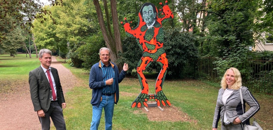 Großes Foto: Stellten die neuen Skulpturen im Schlosspark und das Konzept des Museumsgartens vor, v.l.: Marco van Bel, Leiter Museen Schlosspark und Römerhalle, Künstler Gernot Meyer-Grönhof und OB Dr. Heike Kaster-Meurer.