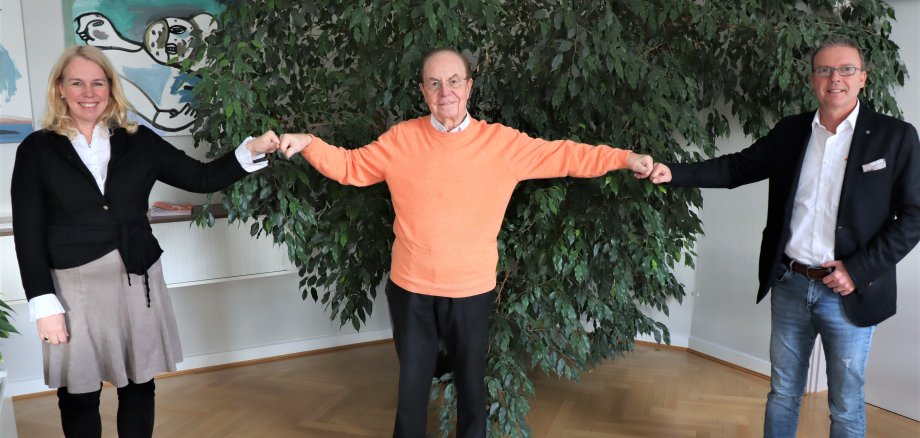 Foto: Dr. Karlheinz Ossig (Mitte) freut sich über die Unterstützung seiner Stiftung durch die Stadt Bad Kreuznach in Person von Dr. Heike Kaster-Meurer und die VG Rüdesheim in Person von Verbandsbürgermeister Markus Lüttger.