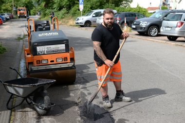 „Heiße Ware“ haben Alexander Kusmannn und Dennis Sünbül im Asphaltmischwerk Sprendlingen geholt. Die Thermokiste auf der Ladefläche ist gefüllt mit vier Tonnen Asphalt, die 180 Grad Temperatur wird in der Kiste gehalten, Damit füllen sich an diesem Tag die vielen Schlaglöcher im Kohleweg. Alexander Kusmann walzt die Masse, die der Kollege Dennis Sünbül in die Löcher geschippt hat, fest. Die Frühlingssonne meint es gut mit den Männern vom Bauhof. Im Sommer brennen zuweilen fast 40 Grad von oben und über 100 Grad dampfen von unten. Alexander Kusmann ist seit 2007 auf dem Bauhof und ging dort schon in die Lehre. Dennis Sünbül wechselte im Vorjah