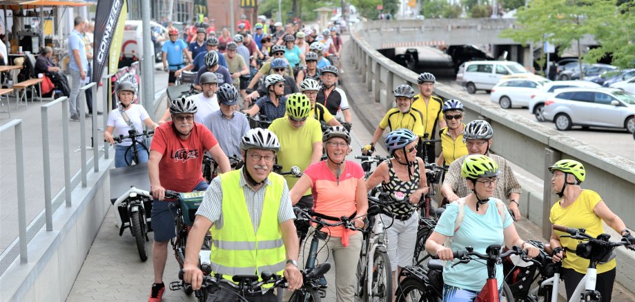 Großes Foto: 66 Stadtradlerinnen und Stadtradler waren bei der Innenstadtrundfahrt zum Auftakt dabei.