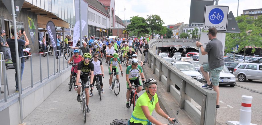 Archivfoto: 118 Stadtradlerinnen und Radler waren 2021 beim Auftakt mit Start und Ziel Fahrradparkhaus am Bahnhof dabei.