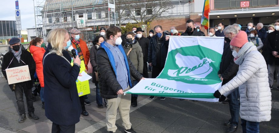 Foto: Am 28. Februar wurde am Europaplatz die Friedensfahne (Mayors for Peace - Bürgermeister für den Frieden) geflaggt.