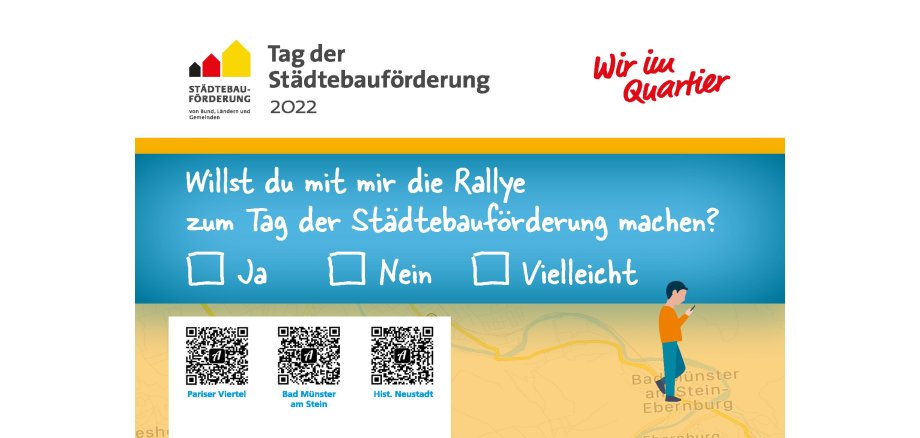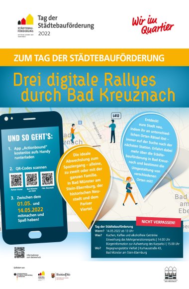 Für alle kleinen und großen Rätselfreunde gibt es zum Tag der Städtebauförderung drei digitale Stadtrallyes. Dazu einfach die APP „Actionbound“ kostenlos aufs Handy herunterladen, einen der drei QR-Codes scannen und die digitale Schnitzeljagd durch eines der Bad Kreuznacher Fördergebiete kann beginnen. Wer bis zum 14. Mai mitmacht und am Tag der Städtebauförderung das richtige Lösungswort weiß, kann einen von 50 Wertgutscheinen für das Thermalfreibad in Bad Münster gewinnen. Die Preise werden durch die Sparkasse Rhein-Nahe zur Verfügung gestellt.