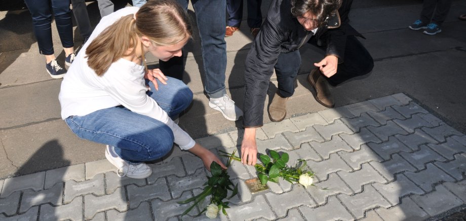 Foto oben: An den Stolpersteinen (hier in der Mainzer Straße 96 für Bertha Eilrich) legten die Schüler*innen Blumen nieder.