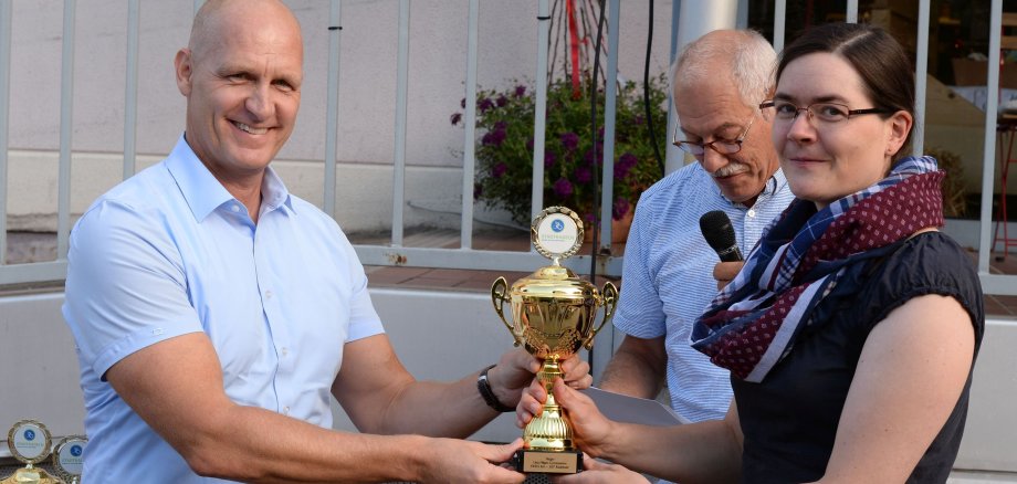 Foto: Sportdezernent Markus Schlosser überreichte Johanna Reitze bei der Abschlussveranstaltung des Bad Kreuznacher Stadtradelns Ende August einen Siegerpokal.