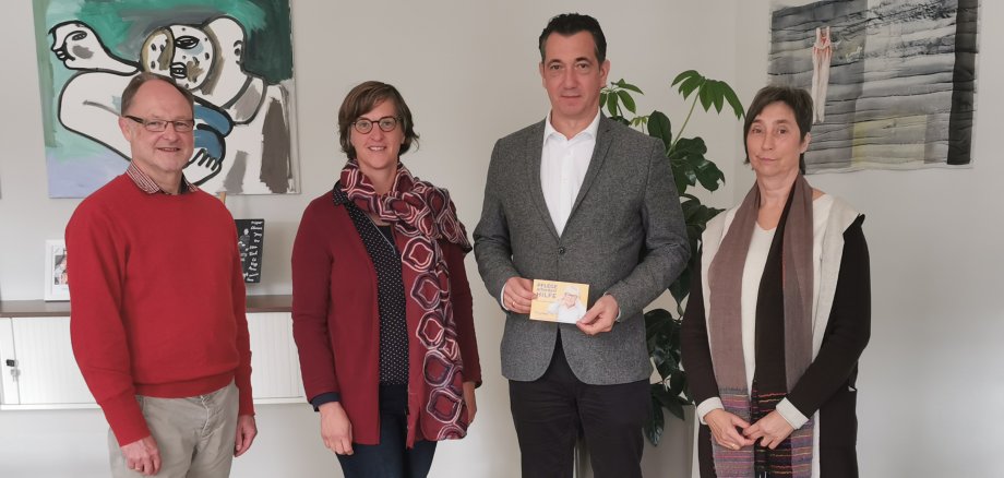 Foto (v.l.): Joachim Kübler, Annerut Marx, OB Emanuel Letz, Anja Wagner; Text: Pflegenetz Bad Kreuznach