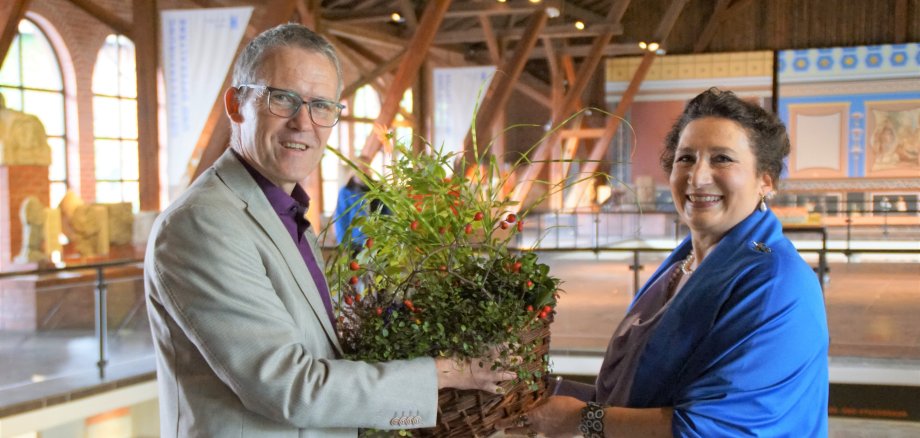Im Anschluss an die Führung bedankte sich der Museumsleiter der Römerhalle Marco van Bel mit einem herbstlichen Gesteck bei Petra Kiefer. In seiner Ansprache vor den Besuchern hob er das Können der erfolgreichen Museumsführerin heraus: Die Ausstellung der Römerhalle zu nutzen und auf der Basis vieler historischen Details eine lebensechte Rolle zu schaffen, erfordere viel Recherchearbeit und stetige Weiterentwicklung der Rolle im schauspielerischen Bereich.
