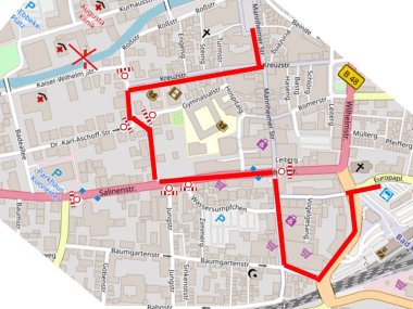 Dazu werden die Wilhelmstraße vom Europaplatz bis zur Baumgartenstraße sowie die Baumgartenstraße bis zur Mannheimer Straße halbseitig gesperrt. Die Salinenstraße zwischen Mannheimer Straße und Rheingrafenstraße und die Schlossstraße zwischen Salinenstraße und Kaiser-Wilhelm-Straße werden voll gesperrt.
