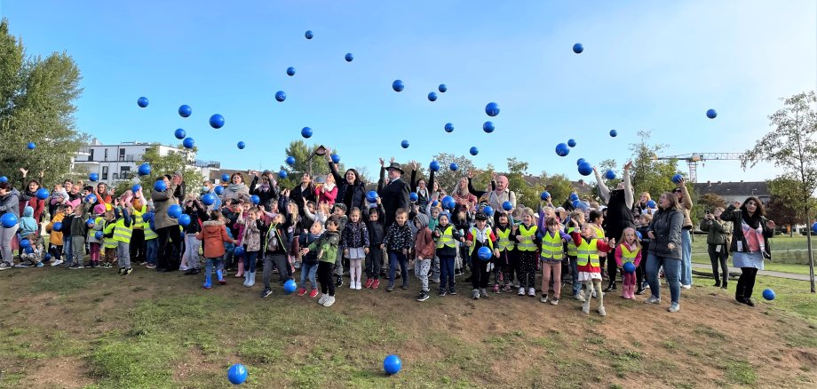 Foto: Als gemeinsames Zeichen zum Weltkindertag warfen alle Kinder einen blauen Ball zum Himmel und versuchten dieser wieder aufzufangen.