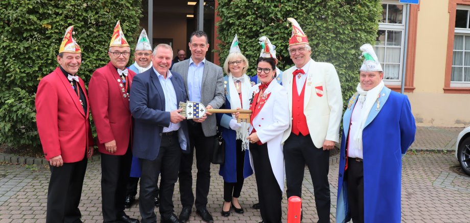 Foto: Schlüsselrückgabe vor dem Stadthaus: OB Emanuel Letz (Mitte) freute sich zusammen mit Bürgermeister Thomas Blechschmidt (vierter von links), dass die „gewohnte Ordnung“ wiederherstellt ist.