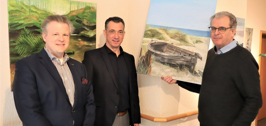 Großes Foto: OB Emanuel Letz (Mitte) besuchte zusammen mit Gernot Meyer-Grönhof (rechts) und Dr. Boris Eitel, Geschäftsführer des Kurstifts Bad Kreuznach, die Ausstellung „40 Jahre ARTPraxis“. Meyer-Grönhof zeigt ein Gemälde der Freizeitkünstlerin Brigitte Winter. Im Hintergrund ein Werk von Angelika Bender.
