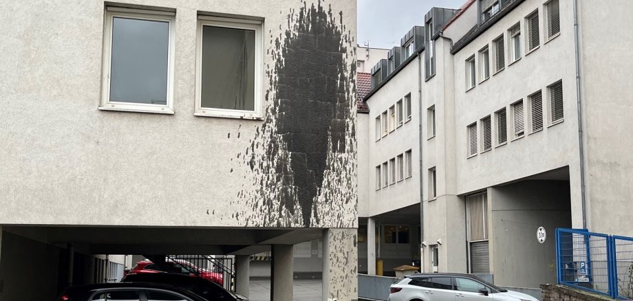 Großes Foto: Eine Wand des Gebäudes Brückes 2-8 wurde großflächig mit Öl verschmutzt.
