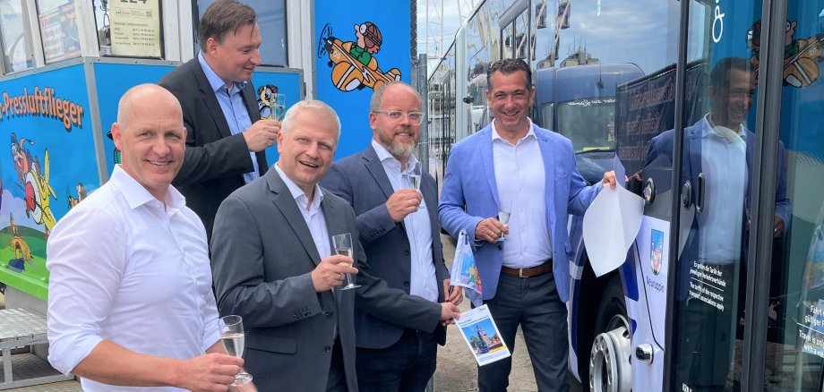 Großes Foto: Jahrmarktsbürgermeister Markus Schlosser, KRN-Geschäftsführer Uwe Hiltmann, Marco Remy vom RNN, Aufsichtsratsvorsitzender Steffen Wolf und Oberbürgermeister Emanuel Letz (v.l.) tauften die drei neuen Gelenkbusse der KRN.