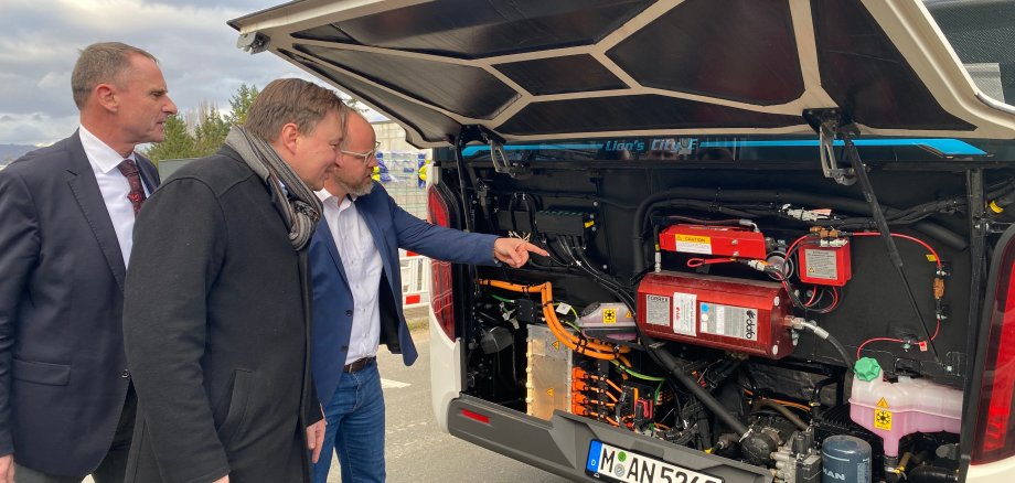 Foto: Aufsichtsratsvorsitzender Steffen Wolf, KRN-Geschäftsführer Uwe Hiltmann und der Flottenleiter des Unternehmens, Wolfgang Hackauf (von rechts) begutachten das Innenleben des Test-E-Busses.