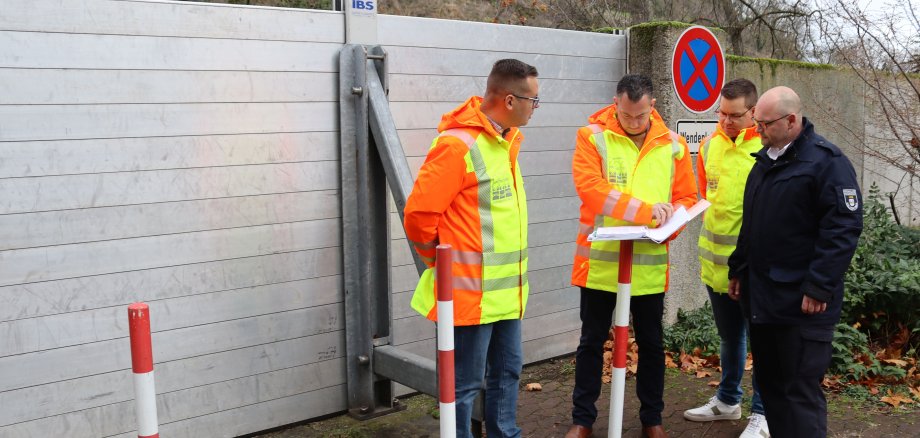 Foto: Den Hochwasseralarmplan studierten Oberbürgermeister Emanuel Letz (2.v.l.) mit Sebastian Kunz (links, Hochwasserschutz in der Abteilung Tiefbau und Grünflächen), Philipp Geib (Leiter Abteilung Tiefbau und Grünflächen) und Michael Seibel (rechts, hauptamtlicher Leiter Feuerwehr). In der Dr. Alfons-Gamp-Straße ist das Tor zur Nahe mit Schutzbaken versperrt.