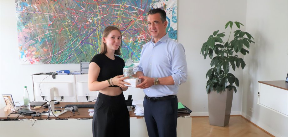 Foto: Schülerpraktikantin Lilly Eckgold begleitete OB Emanuel Letz zwei Wochen bei seiner Arbeit. Für das Interesse bedankte sich Emanuel Letz bei der 16-jährigen zum Abschluss mit einem kleinen Präsent.