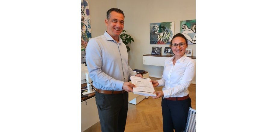 Foto: OB Emanuel Letz übergibt die Baugenehmigung für „Im Wingert 2“ an Feodora Wolff, Projektentwicklerin BPD Immobilienentwicklung