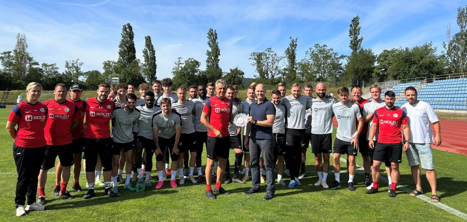 Auch Oberbürgermeister Emanuel Letz gratuliert und freut sich: „Durch die beiden Meisterschaften in der Saison 21/22 Regionalliga Südwest und 22/23 3. Bundesliga tritt die SV Elversberg in der Saison 23/24 in der 2. Bundesliga an. Es ist schön, dass wir einem so erfolgreichen Verein eine Trainingsstätte bieten können.“