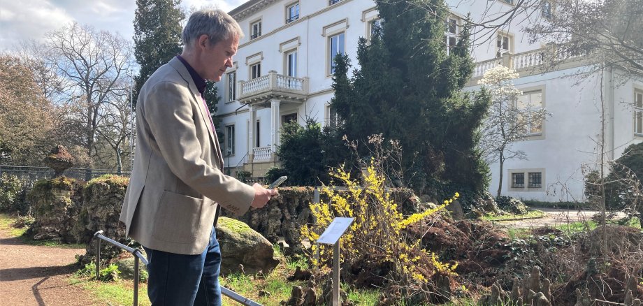 Großes Foto: Museumsleiter Marco van Bel stellt den neuen Audioguide im Schlosspark vor.