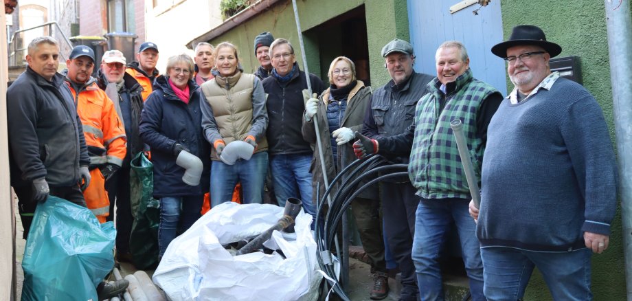 Foto: Viele Helferinnen und Helfer konnte Steffen Kaul (rechts) für seine Aufräumaktion gewinnen. Von der Stadt packten Bürgermeister Thomas Blechschmidt, Georg Bürger (2. und 3.v.r.) und drei Mitarbeiter des Bauhofes mit an.