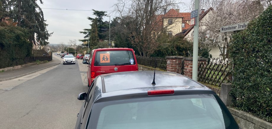 Großes Foto: Aktuelle Situation in der Winzenheimer Straße. Mit der Umsetzung der neuen Regelung wird das Parken auf dem Gehweg nicht mehr geduldet.