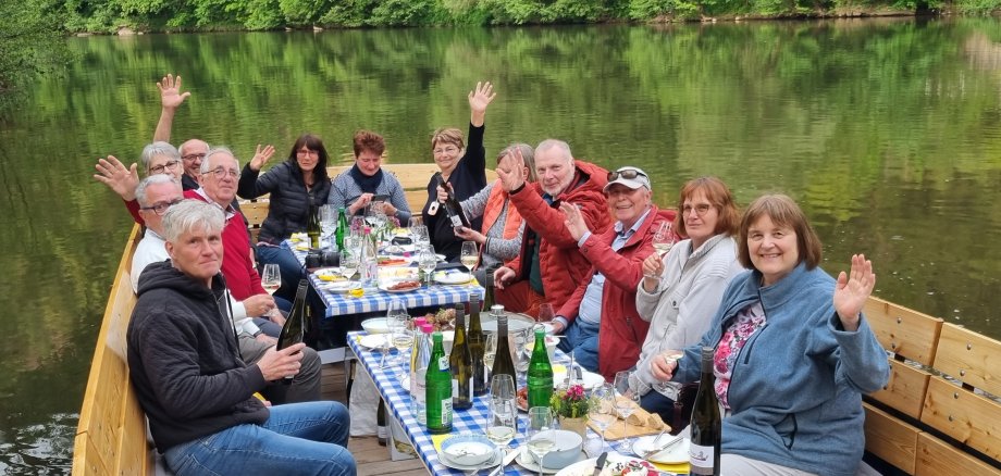 Foto: Zum Abschluss eine fröhliche Weinprobe auf der Huttentalfähre. Foto: Christine Simmich