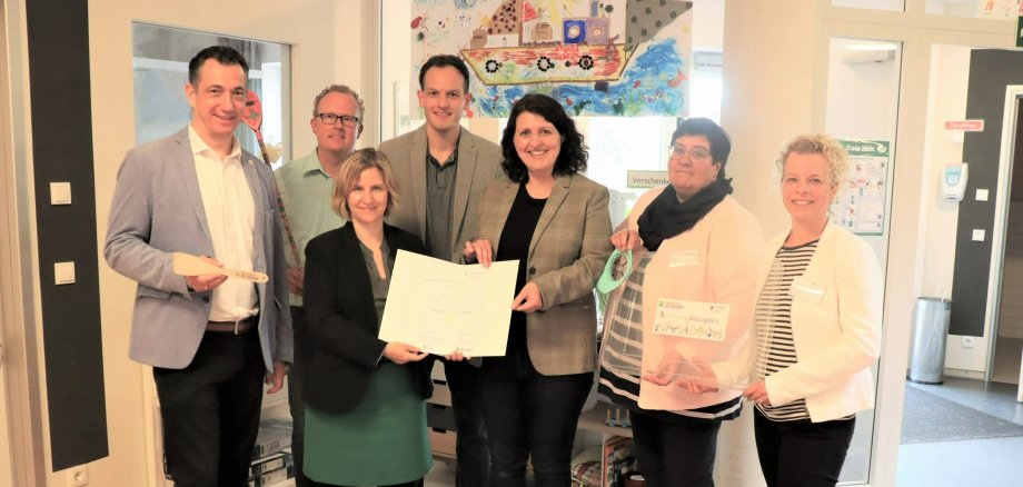 Foto: Freuen sich über den bestandenen Re-Audit der Kita Hermann Rohloff zur Ernährungs-Kita (v.l.): OB Emanuel Letz, Jörg Erbenich, Koch und Verpflegungsbeauftragter der Kita, Umweltministerin Katrin Eder, Nils Wachner, Abteilungsleiter Kindertagesstätten, Kita-Leiterin Irina Söntgerath, Doris Fey und Anne Böhmer, beide Fachzentrum Ernährung Rheinland-Pfalz