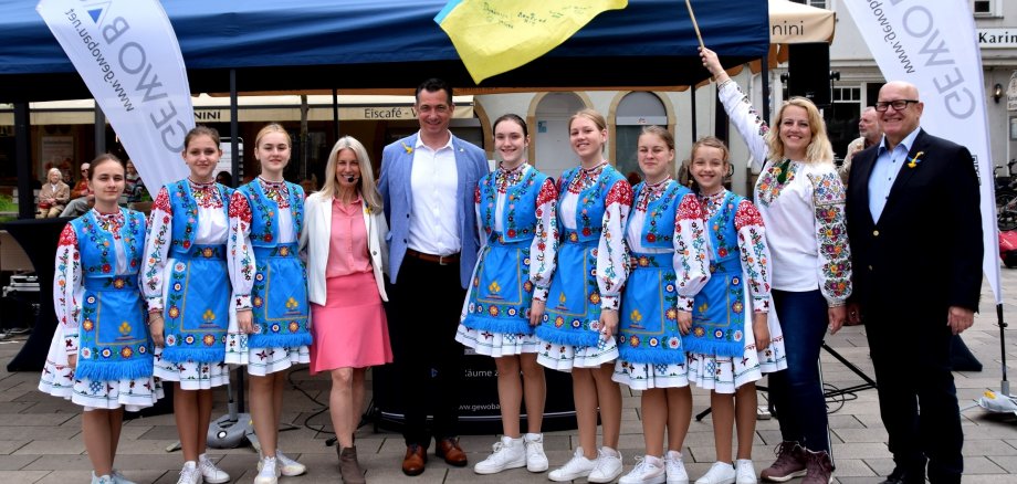 Höhepunkt war der Auftritt der ukrainischen Folkloregruppe „Zernyatko“. Die sieben Mädchen in ihren Trachten sangen und tanzten sich in die Herzen der Zuschauer. Der Begeisterung tat auch der einsetzende Nieselregen keinen Abbruch. Für das schützende Zeltdach und die Musikanlage sorgte Gewobau-Geschäftsführer Karl-Heinz Seeger und sein Team. Seeger hatte die Gruppe zum Abendessen eingeladen. Die Mädchen dankten es ihm mit einem Abschiedslied.