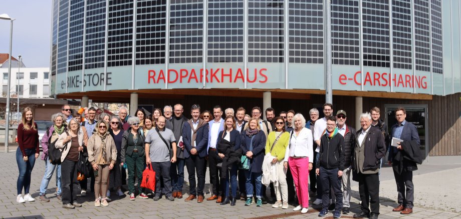 Betreut wurden die Gäste von Bauamtsleiter Eduard Schuckmann und Bärbel Germann, die in der Verwaltung für das Projekt MIP/Fahrradparkhaus zuständig ist. Zur Führung durch das Fahrradparkhaus kam auch Oberbürgermeister Emanuel Letz hinzu und die Führung begleitete auch der ehemalige Bauingenieur der städtischen Hochbauabteilung Joachim Decker. Zur Architektur und nachhaltigen Bauweise informierte Johannes Blum vom Büro slb/ architekten und Ingenieure.