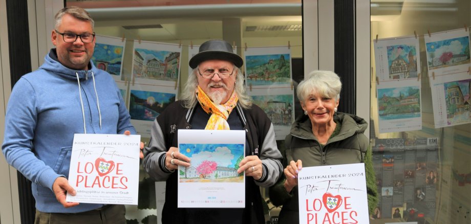 Foto: Oliver Kelm (Quartiersmanager Neustadt, links) und Annette Bauer (Förderverein Klein-Venedig Bohème) werben für den neuen Kalender von Peter Trautmann (Mitte).