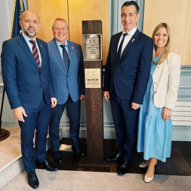 Die Bourger staunten über eine Abbildung des Gedenksteins vom historischen Besuch Adenauer-de Gaulle am 26. November 1958 im Kurhaus Bad Kreuznach: als 3D-Laserfoto im in einem beleuchteten Glasstein in eine Holzstele gefasst und einer Plakette zum 60. Jahrestag der Städtepartnerschaft. Das Geschenk werde einen Ehrenplatz im Foyer des Rathauses bekommen, so dass jeder Bourger sehe, was die Städtepartnerschaft bedeute, bedankte sich Bürgermeister Debat.