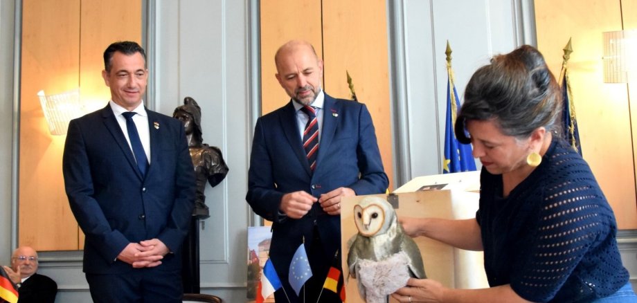 Foto ganz oben: Jean-François Debat (rechts) und Emanuel Letz erneuerten die Städtepartnerschaft. Eine Marionette in Gestalt eines Kauzes schenkte die Stadt Bourg-en-Bresse der Stadt Bad Kreuznach für das Museum für PuppentheaterKultur (PuK). Fotos: Charlotte Eberwien