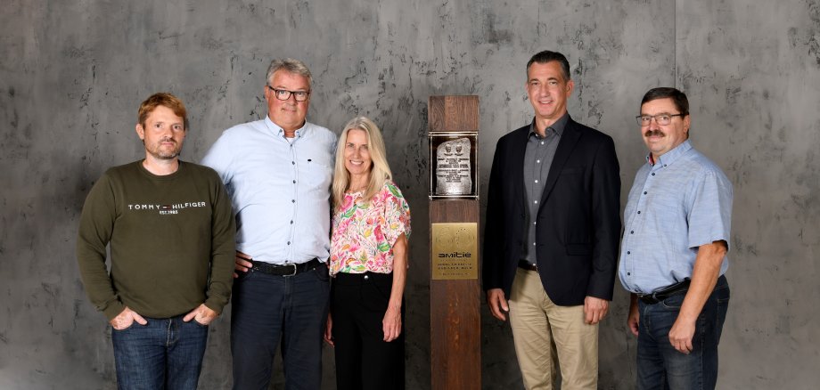 Vor dem Transport des Geschenkes nach Bourg bedankte sich der OB bei einem Besuch im Fotoatelier Sawatzki bei den Machern: Markus Schmidt für die Gestaltung des 3D-Laserfotos, Goldschmiedemeister Rainer Schoebel für die Anfertigung der Plakette mit dem Jubiläumslogo. Die schicke Holzstele wurde von Tobias Heib geschreinert.