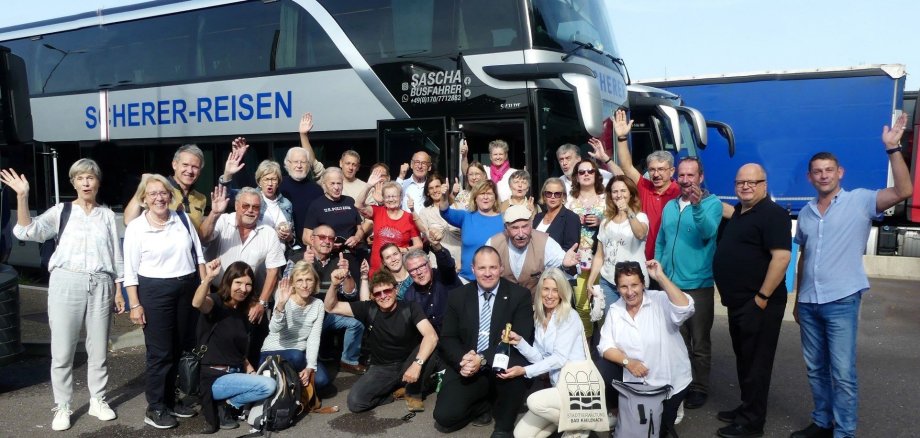 Foto ganz oben: Der Geist der Freundschaft wehte bei der offiziellen Bad Kreuznach Delegation durch den bequemen Doppeldeckerbus und über alle Parteigrenzen und politischen Differenzen hinweg. Es herrschte eine heitere-friedliche Atmosphäre. Die letzte Rast auf der Heimreise wurde zum einem Abschlussfoto genutzt. Koordinatorin Christine Simmich bedankte sich im Namen aller mit einer Flasche Jubiläumswein bei Busfahrer Sascha Ostermann. oto: Charlotte Eberwien