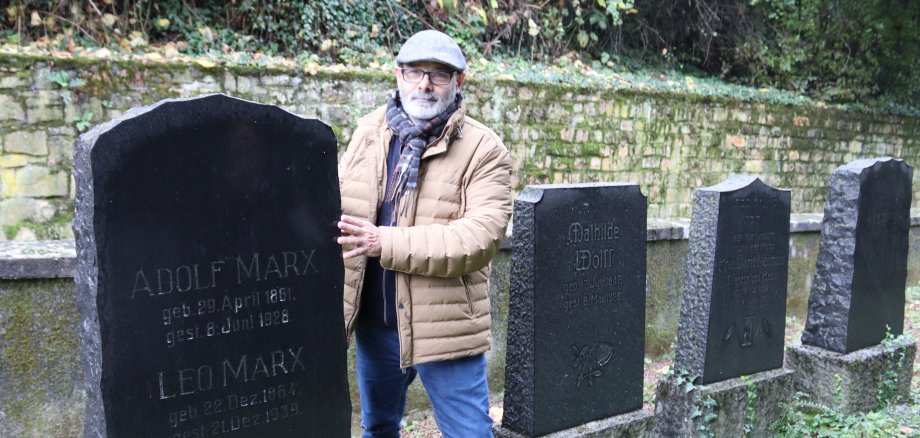 Großes Foto: Yann Mars am Grab seines Ur-Ur-Großvaters Leo Marx und dessen Bruder Adolf. Nun möchte er eine Gedenktafel haben, die an seine Ur-Ur-Großmutter Regina Ida Marx erinnert, die 1943 im KZ Theresienstadt ermordet wurde.