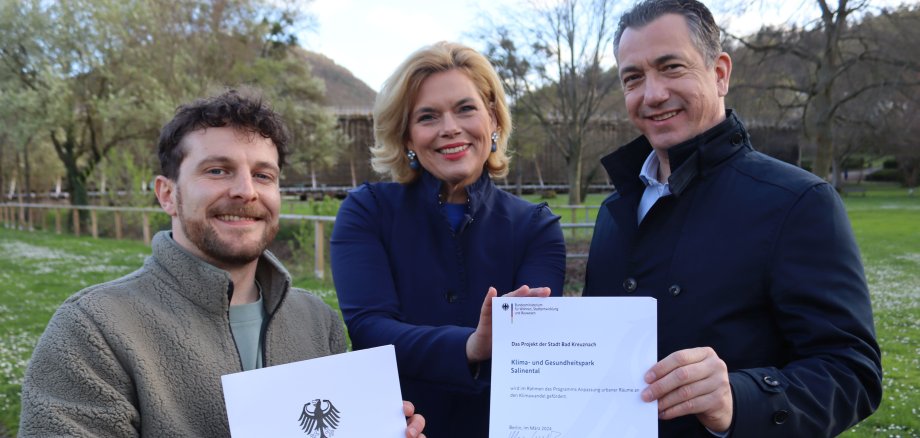 Foto: Den Förderbescheid brachte die Bundestagsabgeordnete Julia Klöckner Oberbürgermeister Emanuel Letz mit. Klimaschutzmanager Rudi Rohrbacher (links) erläuterte, für welche Maßnahmen die Mittel im Salinental verwendet werden.