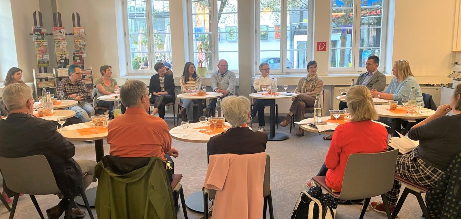 Foto: Rund 20 Künstlerinnen und Künstler sowie Kulturschaffende nahmen am ersten Kulturstammtisch in der Stadtbibliothek teil. Foto Grit Gigga