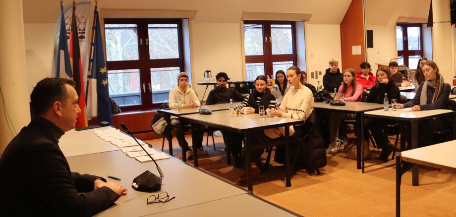 Fotos: Der Leistungskurs Sozialkunde der Jahrgangstufe 12 der IGS Sophie Sondhelm besuchte OB Emanuel Letz im Rathaus. Fotos: Hansjörg Rehbein