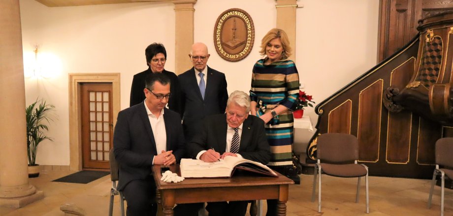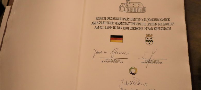 Mit seiner Unterschrift im Gästebuch der Stadt Bad Kreuznach setzte Joachim Gauck einen würdigen Schlusspunkt unter seinen Besuch. „Es ist uns eine große Ehre, dass Herr Gauck unsere Stadt besucht und seine Gedanken mit uns geteilt hat. Sein Eintrag in unser Gästebuch wird uns an diesen wichtigen Abend und an unsere Verantwortung für unsere Demokratie erinnern“, unterstrich der Oberbürgermeister die Bedeutung des Abends