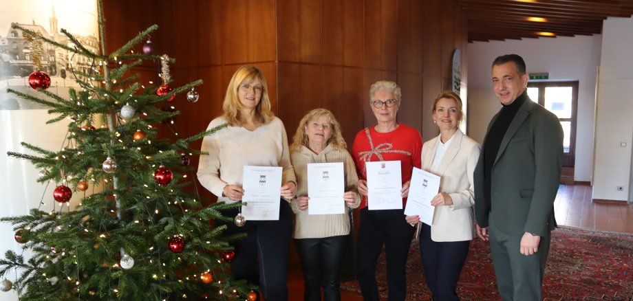 Im adventlich geschmückten Casino des neuen Rathauses begrüßte Oberbürgermeister Emanuel Letz Jubilarinnen und Jubilare sowie die Mitarbeiterinnen und Mitarbeiter, die in den vergangenen beiden Jahren in den Ruhestand gingen. Der OB gratulierte und bedankte sich bei Pia Gans (2.v.r.), Zentrale Dienste, für 40 Jahre Stadtverwaltung. Glückwunsch und Dank zum Dienstjubiläum „25 Jahre“ gab es für Heike Stephan-Schlitz (links) Jugendzentrum "Die Mühle", Monika Skribinski (2.v.l), Reinigungsfachkraft Grundschule Winzenheim, und Anna Ludwig (rechts), Kita Gensinger Straße.