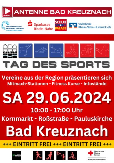 Der Tag des Sports wird gesponsert durch den Schuh- und Sportpalast Bad Kreuznach, die Sparkasse Rhein-Nahe, die Volksbank Rhein-Nahe-Hunsrück und die Kreuznacher Stadtwerke.