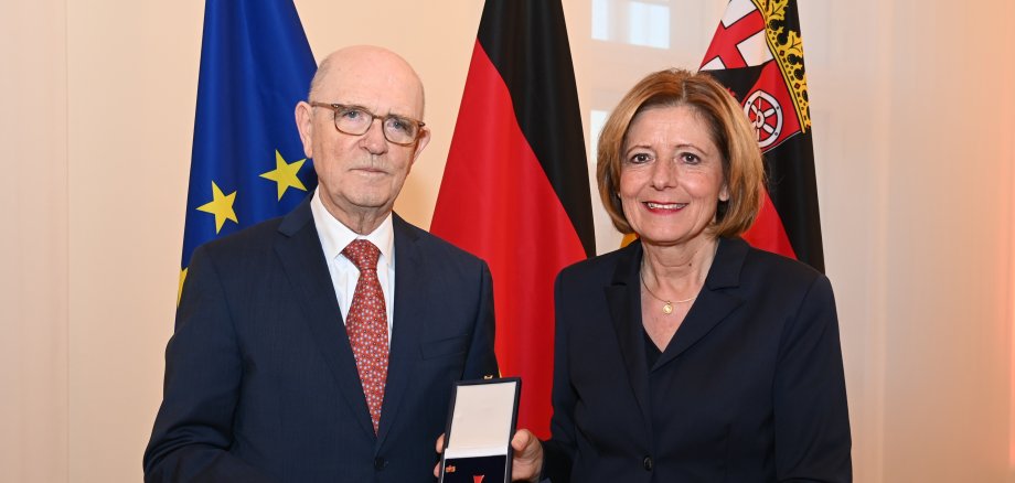 Großes Foto: Ministerpräsidentin Malu Dreyer überreicht Werner Fuchs das Verdienstkreuz 1. Klasse des Verdienstordens der Bundesrepublik Deutschland. Foto: Staatskanzlei RLP / Schäfer