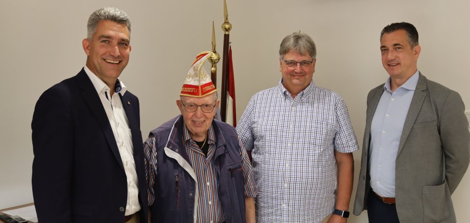 Foto: Mit einer Spende der Sparkasse Rhein-Nahe erfreuten Oberbürgermeister Emanuel Letz (rechts) und Thorsten Ackermann (Sparkasse Rhein-Nahe) Peter Hasselwander (2.v.l.) und Julian Gamper vom Förderverein der Weiße Fräck im VfL.