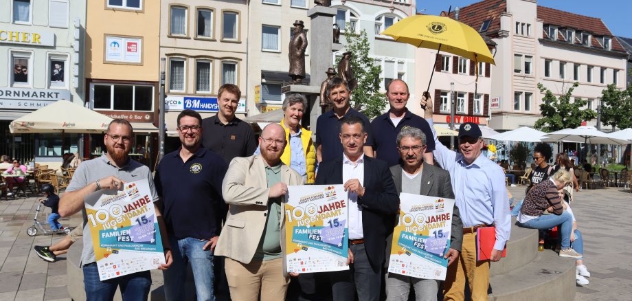 Foto: Stadt, Lionsclub und die AG „100 Jahre Jugendamt“ freuen sich schon auf das große Familienfest am 15. Juni. Von links vorne: Sebastian Feistel, Michael Hübner, Marvin Jung, Emanuel Letz und Ahmet Dasli. Von links hinten: Christopher Karras, Helmi Friess- Vonderlohe, Andreas Scherbel, Christian Closhen und Julius Thress.