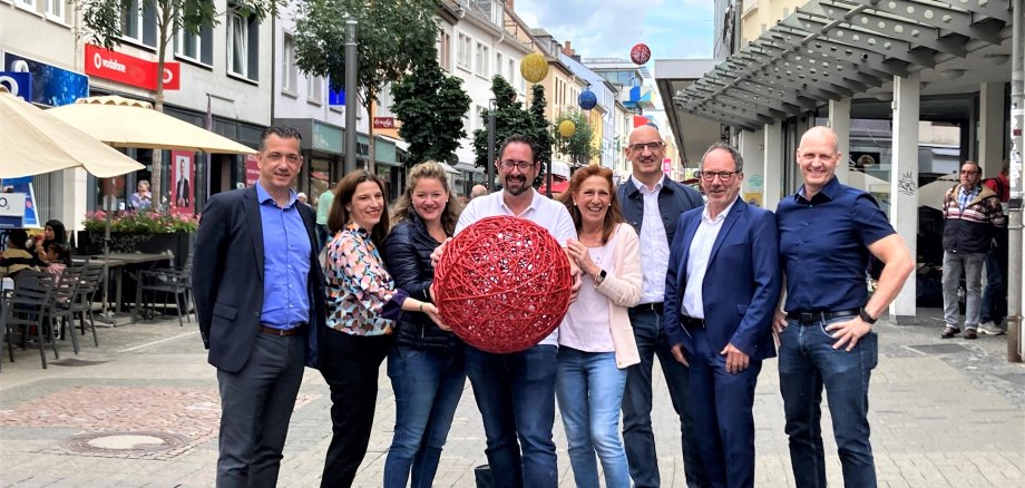 Foto: Stellten die „Organic Balls“ in der Fußgängerzone vor (v.l.): OB Emanuel Letz, Iris Prencipe und Claudia Holbach (beide „Wir sind Kreuznach“), Michael Fluhr (Amtsleiter für Wirtschaftsförderung und Liegenschaften), Manu Gilles („Wir sind Kreuznach“), Michael Pohl (Gesundheit und Tourismus für Bad Kreuznach GmbH), Klaus-Dieter Dreesbach (Unternehmensgruppe Kreuznacher Stadtwerke) und Beigeordneter Markus Schlosser. Foto: Isabel Gemperlein