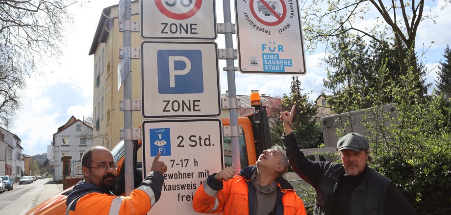 Foto: Hoffentlich hilft es was: Georg Bürger (rechts) und seine Mitarbeiter Michael Washington (links) und Mario Schießel weisen auf das neue Schild an einem der größten Müll-Hotspots, Ecke Salinenstraße/Baumstraße.